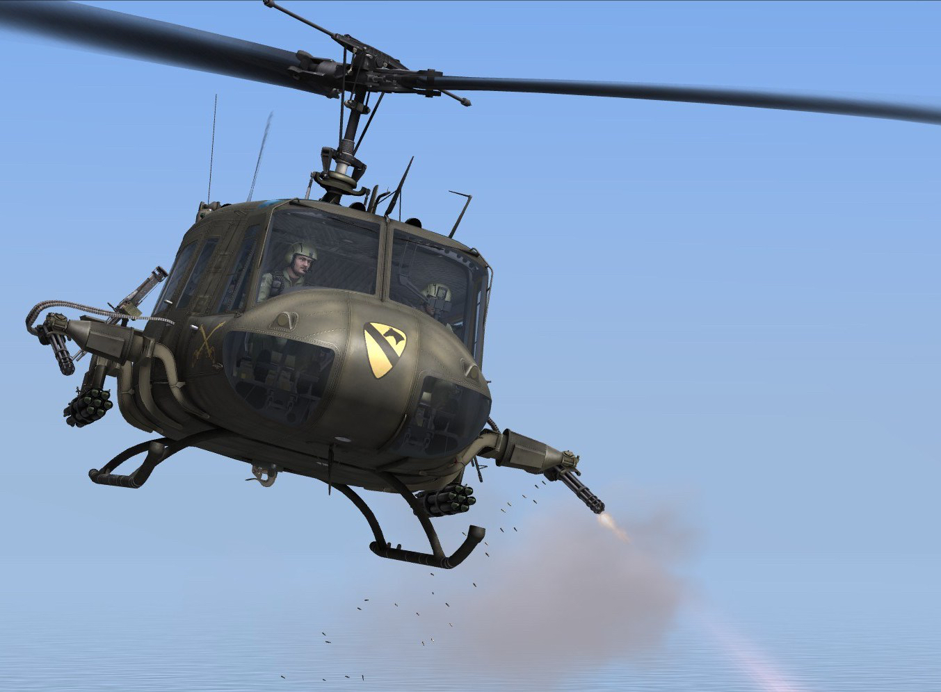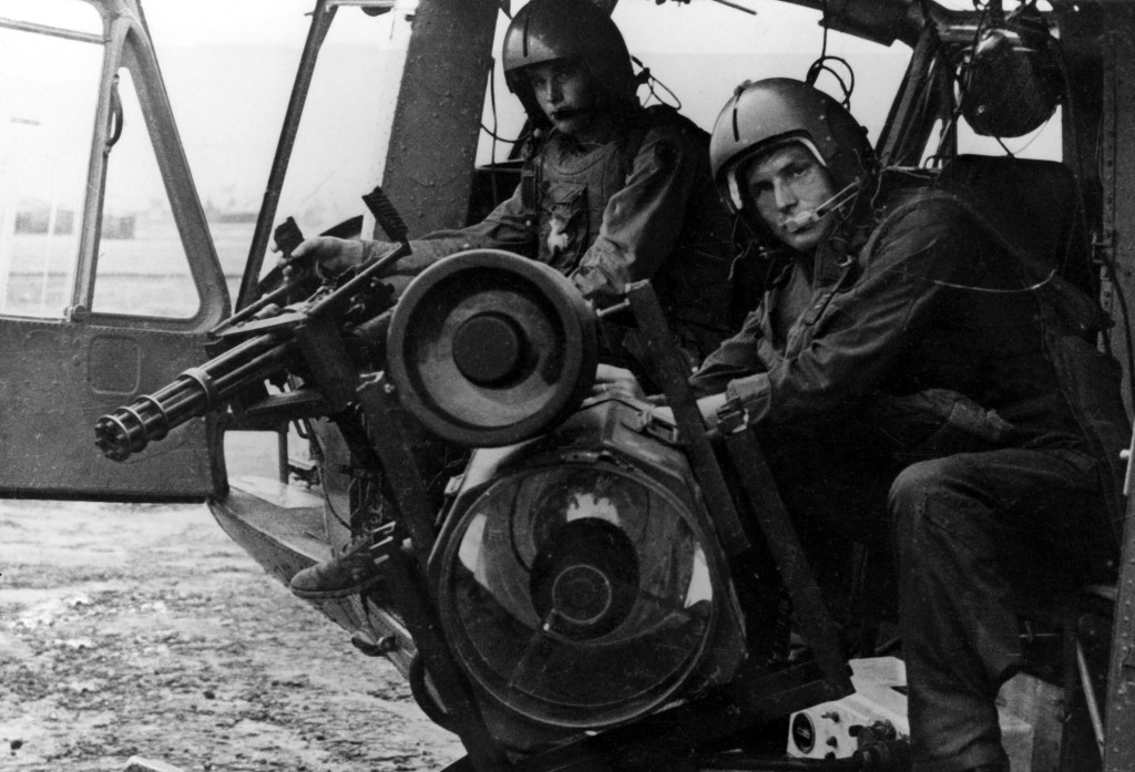 1st Cav Huey Gunship spraying lethal 7,62mm fire from M-134 minigun (note expended shells behind barrel). (U.S. Army photo)