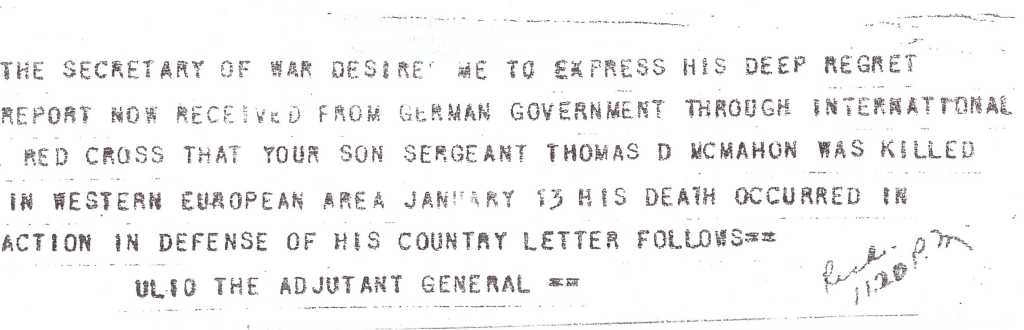 Telegram received by his parents, reporting his death as Jan. 13, 1945 (McMahon archives)